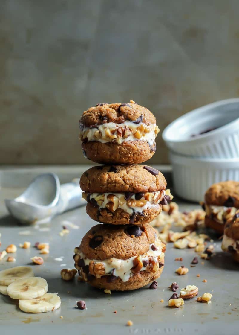 - ASSEMBLE THE SANDWICHES:Place the chopped walnuts and mini chocolate chips in small bowls. Start spreading on the banana ice cream, a few tablespoons or so, onto the bottom flat side of the cookie, spreading evenly, before topping with another cookie. Sprinkle on crushed walnuts and mini chocolate chips, then place on a plate and transfer to freezer. Repeat this process with the remaining cookies.Store ice cream cookie sandwiches in freezer until ready to eat, 20 minutes at the most. Then DIG IN!